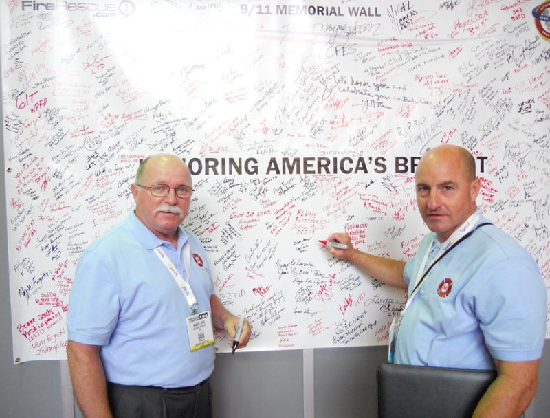 ISO Community Mitigation Director Butch Cobb and ISO Community Mitigation Manager Skip Gibson sign a 9/11 memorial wall at FRI.